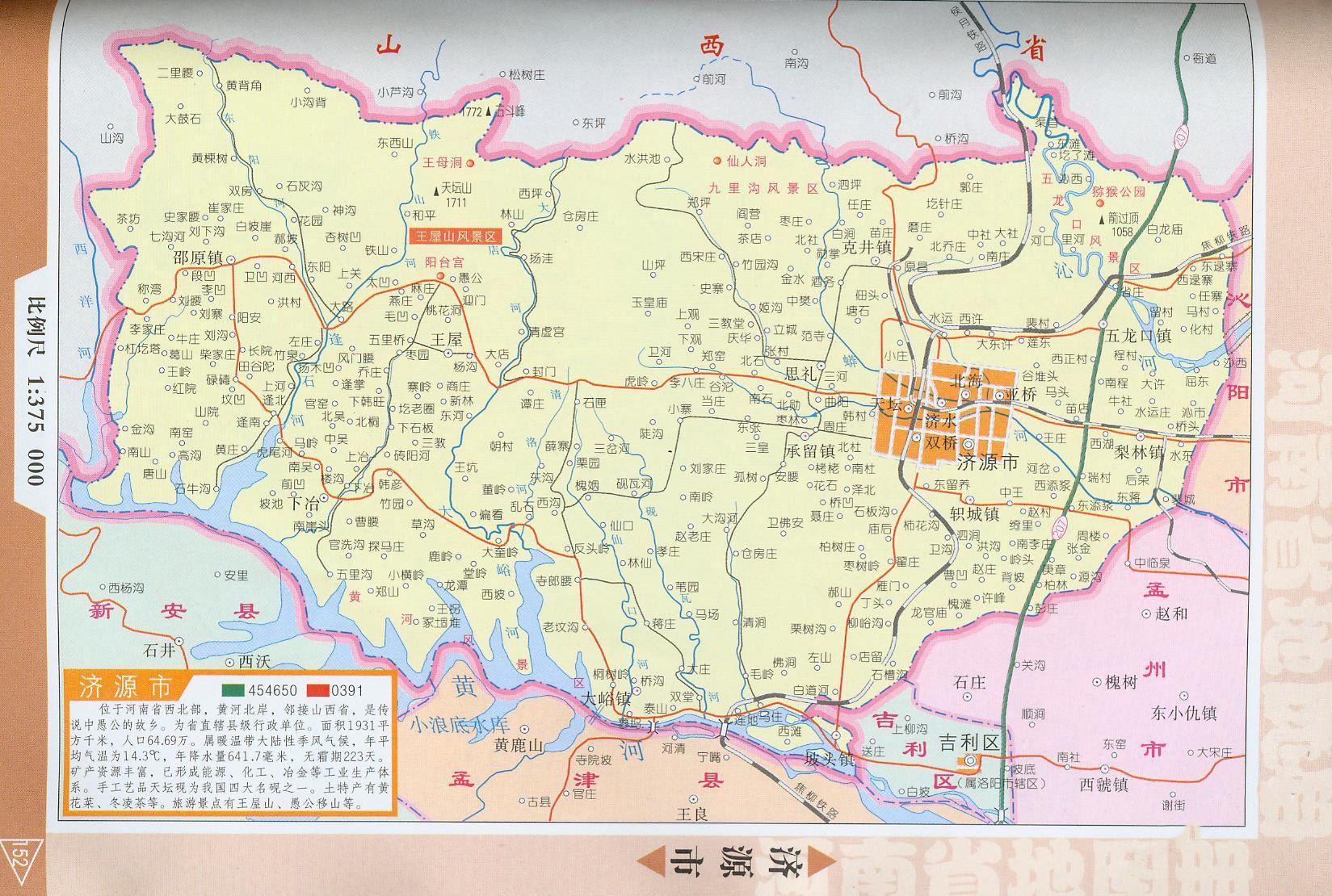 济源位于河南省西北部,因济水发源而得名。济源地处东经112°01′~112°45′,北纬34°53′~35°16′之间,东西长66公里,南北宽36.5公里,面积1931平方公里,人口70万。济源北依太行山,与山西省的晋城市、阳城县毗邻;南临黄河,与洛阳市的孟津县、新安县隔河相望;西踞王屋山,与山西省运城市的垣曲县接壤;东...